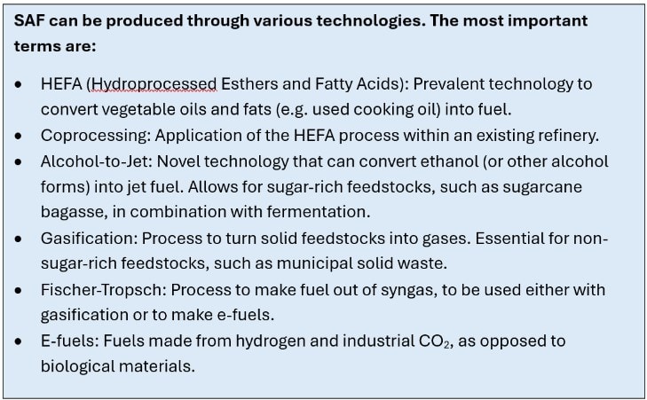 Burning SAF will still release CO2 into the air, but the difference with fossil fuel is that it is earlier in its lifecycle. SAF is made from alternative sources (feedstocks) such as crops, waste streams or renewable electricity. The carbon used for SAF production would otherwise have gone into the atmosphere, for example from dead trees that rot. The amount of CO2 reduction linked to a volume of SAF is highly dependent on the feedstock used and can be close to 100%.
