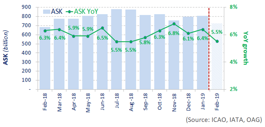 Capacity worldwide increased by +6.4% YoY in January 2019, +0.3 percentage point higher than the growth in the previous month (+6.1%). According to the airline schedules, the expansion of capacity is expected to be at +5.5% for February 2019.