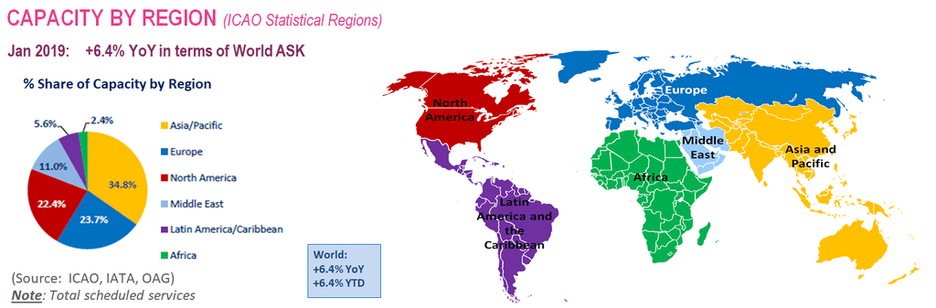 Worldwide capacity expanded by +6.4% YoY in January 2019. All regions posted acceleration in capacity expansion except Europe and the Middle East with the latter posting the most significant deceleration.