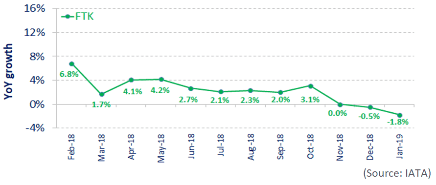 World freight traffic reported a negative growth of -1.8% YoY in January 2019, -1.3 percentage points lower than the growth in the previous month. After experiencing a third consecutive negative growth, freight traffic reached its slowest pace in twelve months. Freight traffic continues to be impacted by the apprehensions surrounding Brexit and the on-going US-China trade tensions. All regions, except for Africa, North America and Latin America/Caribbean posted a decline in growth, and the other three regions posted negative growth. The weakest performance was reported by the Middle East, followed by Asia/Pacific. North America remained as the fastest growing region, followed by Africa, albeit with moderate growth.