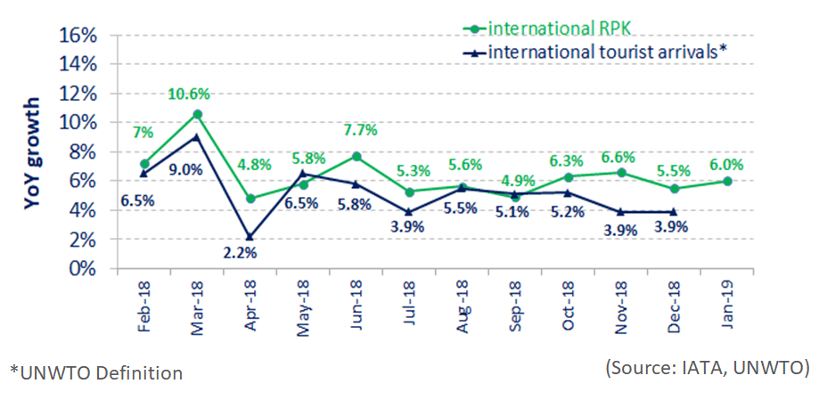 International passenger traffic grew by +6.0% YoY in January 2019, +0.5 percentage point higher than the growth in the previous month. All regions accelerated in traffic growth except Europe and Latin America/Caribbean. Europe, however, remained as the strongest international market. The growth of international tourist arrivals* followed a similar monthly trend.