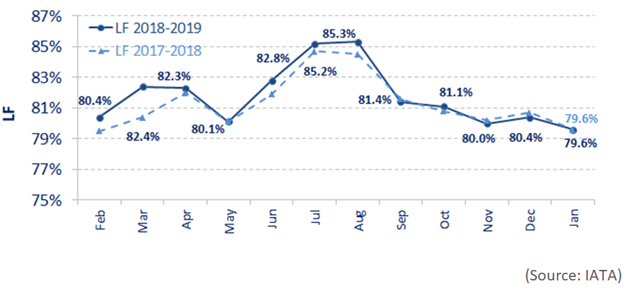 The passenger Load Factor reached 79.6% in January 2019, -0.8 percentage point lower than the LF recorded in the previous month. As traffic growth remains at par with capacity expansion, the January LF was the same as the rate in January 2018.