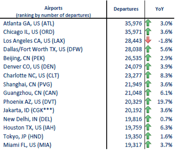 In terms of aircraft departures, the top 15 airports reported growth of +4.3% YoY. Fourteen out of the top 15 airports posted YoY increases. Atlanta ascended by 1 position to 1st and grew at +3.0%. The strongest growth in operations was recorded by Phoenix at +19.7%, followed by Charlotte at +8.3%.