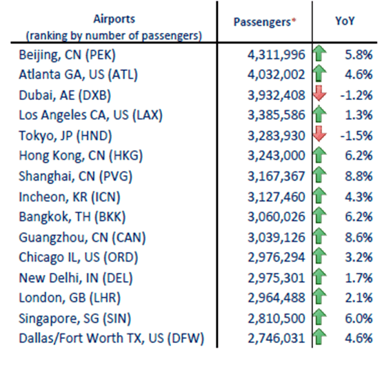 In terms of passengers, the top 15 airports reported growth of +3.9% YoY. All the top 15 airports posted YoY increases, except for Tokyo and Dubai with a decline of -1.5% and -1.2%, respectively. Beijing topped the list and grew at +5.8%. Shanghai reported the highest growth at +8.8%, followed by Guangzhou and Hong Kong at +8.6% and +6.2%, respectively.