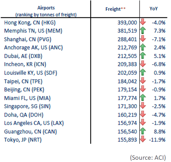 In terms of freight, the top 15 airports reported a decline of -1.1% YoY. Nine out of the top 15 airports posted YoY decreases. The most significant decline was posted by Tokyo (-11.9%), followed by Shanghai (-7.1%). Hong Kong topped the list albeit, with a decline of (-4.0%). Guangzhou became the fastest growing airport with a +8.8% YoY increase.