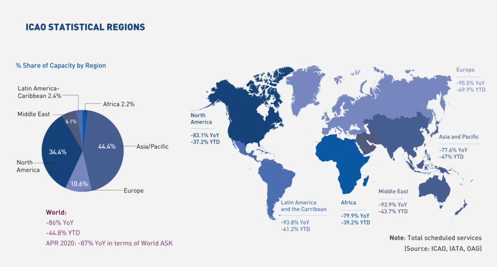 Capacity worldwide fell by -86.0% YoY in May 2020, +1.0 percentage point up from the decline in the previous month (-87.0%). With gradual ease of lockdowns and airlines slowly resuming flights, world capacity is expected to lift slightly in June 2020 to -78.7% contraction YoY.