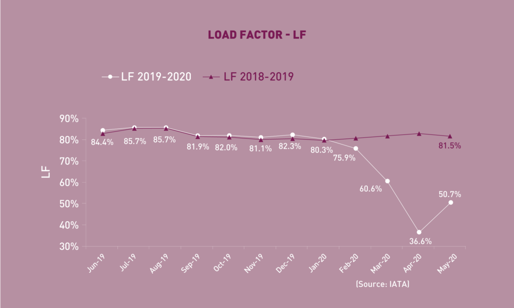 The passenger Load Factor reached 50.7% in May 2020, +14.1 percentage points up from the previous month. As a result of passenger traffic falling faster than capacity reduction, the May LF was -30.8 percentage points lower than the rate in the same period of 2019.