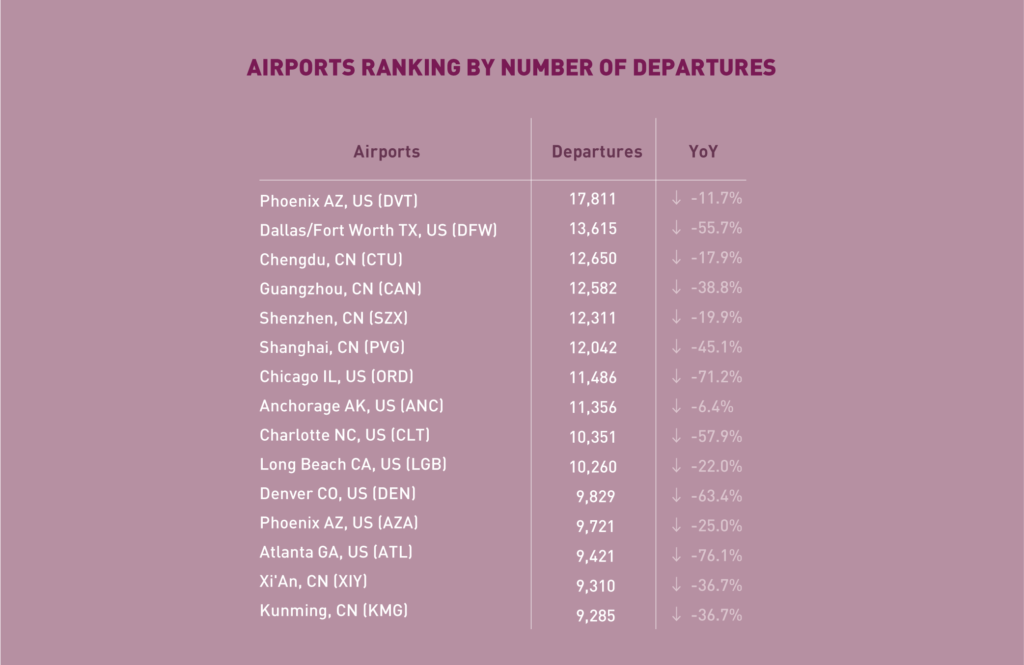 In terms of aircraft departures, all the Top 15 airports reported declines with a combined fall of -46.7% YoY. All the Top 15 airports were either US or Chinese airports. Phoenix (Deer Valley) ranked 1st, with a smaller decline of -11.7%, supported by general operations. Atlanta, once again, recorded the most significant fall of -76.1%, followed by Chicago (-71.2%).