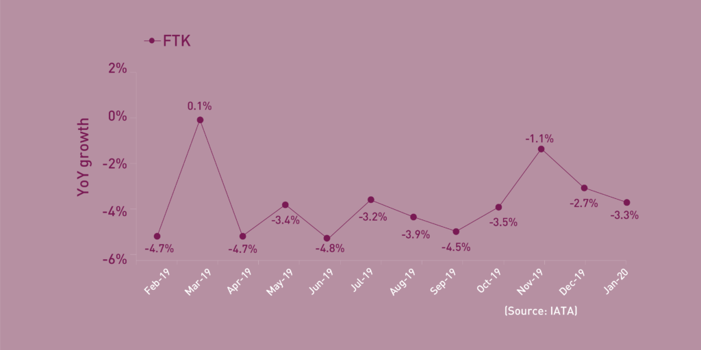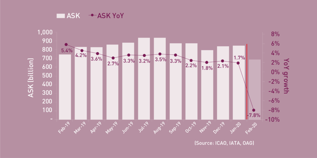 Capacity worldwide increased by +1.7% YoY in January 2020, -0.4 percentage point lower than the growth in the previous month (+2.1%). The containment measures will lead to further flight cancellations and travel restrictions. As a result, capacity is expected to slump to -7.8% YoY in February 2020.