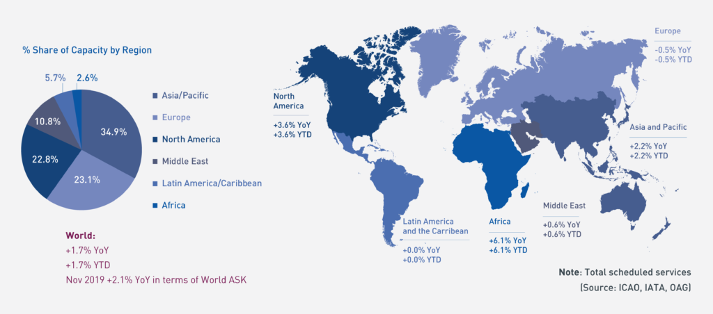 Worldwide capacity expansion grew by +1.7% YoY in January 2020. Four regions, Asia/Pacific, Europe, Latin America/Caribbean and North America, decelerated in capacity expansion, with Europe being the only region recording negative growth at -0.5%. Africa continued to be the fastest capacity expanding region, followed by North America.
