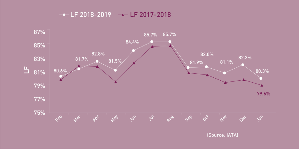 The passenger Load Factor reached 80.3% in January 2020, -2.0 percentage points lower than the previous month. As traffic growth outpaced the capacity expansion, the January LF was +0.7 percentage points higher compared to the rate in the same period of 2019.