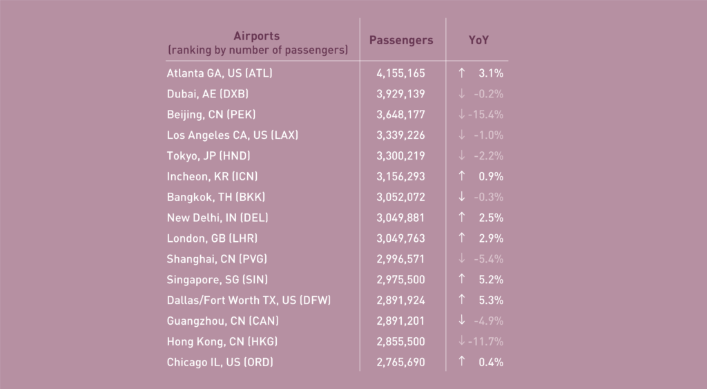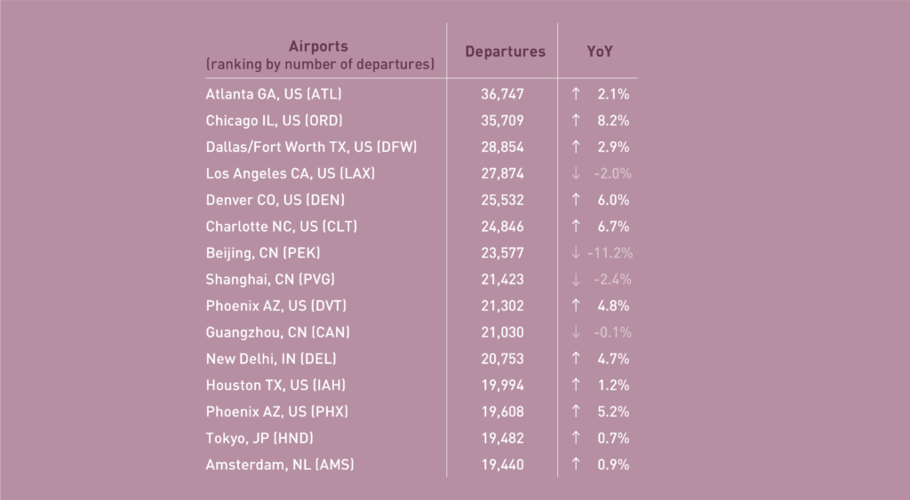 In terms of aircraft departures, the Top 15 airports reported a growth of +1.9% YoY. Eleven out of the Top 15 airports posted YoY increases. Atlanta ranked 1st up by +2.1%, whereas, Chicago became 2nd albeit recording the highest growth at +8.2%. Beijing experienced the most significant decline at -11.2% due to flight cancellations.