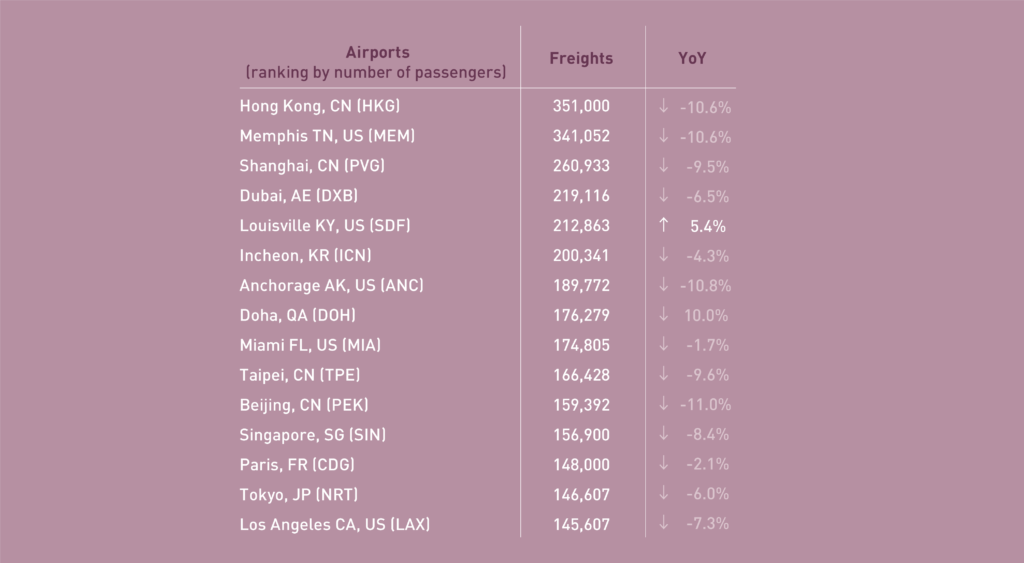 In terms of freight, the Top 15 airports reported a decline of -6.4% YoY. Most of the Top 15 airports posted declines with double-digit fall in 4 major hubs. Beijing slumped by -11.0%, followed by Anchorage at -10.8% and Hong Kong at -10.6%. Two airports contributed positively to freight traffic with Doha recording the highest growth at +10.0% followed by Louisville at +5.4%.