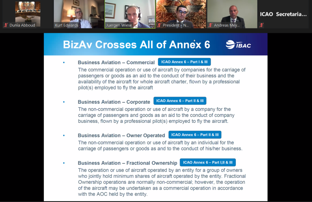 For the last ANC Talk of the 214th session of the Air Navigation Commission, IBAC was invited to present the organization’s mission, mandate and structure, followed by an overview of business aviation and its contribution to economic and societal development. IBAC’s Standard Programmes, such as the International Standard for Business Aircraft Operations (IS-BAO), the International Standard for Business Aircraft Handling (IS-BAH), Business Aviation’s commitment on climate change and insight into how IBAC sees the future, were also discussed. Guests were Ali Ahmed Alnaqbi, Chairman of the Governing Board; Juergen Wiese, Vice Chairman of the Governing Board; Kurt Edwards, Director General and Andreas Meyer, Director, ICAO Liaison.