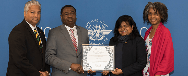 The President of the ICAO Council, Dr. Olumuyiwa Benard Aliu (below centre left), presented a Council President Certificate to Her Excellency Janice Miller (centre right), High Commissioner for Jamaica to Canada, in recognition of Jamaica’s exemplary aviation safety oversight improvements in 2016.